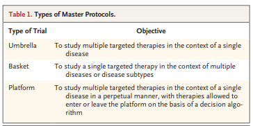 "Master Protocols to Study Multiple Therapies, Multiple Diseases, or Both" in 2017 by Woodcock and LaVange defines Master protocols include three type of trials: Umbrella, basket, and platform trials.